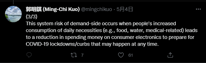 郭明祺特别强调说,需求的下降所带来的问题要远大于产品生产方面遇到的困难,而这对于所有品牌和上游供应商来说,是潜在的系统性风险,尤其是在2022年下半年。