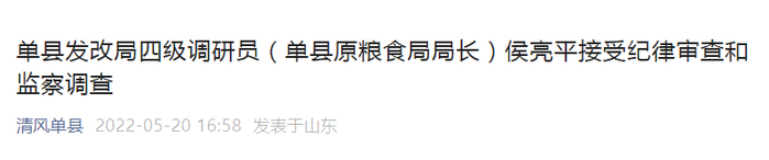 据清风单县微信号5月20日消息,山东菏泽市单县发改局四级调研员(单县原粮食局局长)侯亮平涉嫌严重违纪违法,目前正接受单县纪委监委纪律审查和监察调查。