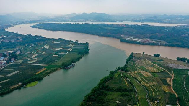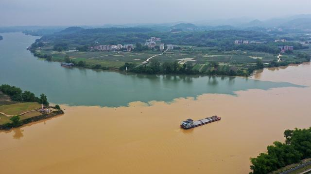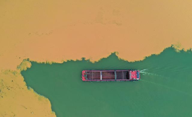 2022年5月20日,广西南宁市。日前,邕江上游左右江交汇处,出现了“鸳鸯江”景观。空中俯瞰,左江夹杂泥沙翻卷而下势如洪水猛兽,而右江却碧如玉带静静流淌,一清一浊、泾渭分明。