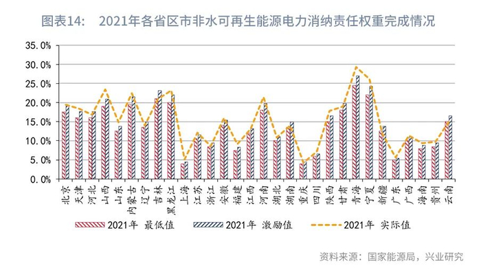 我国于2020年开始实施可再生能源消纳责任制,每年由国家能源主管部门对各省电力消费设定可再生能源电力消纳责任权重,包括总量消纳责任权重和非水电消纳责任权重,并开展年度考核。2021年下达全国最低可再生能源电力总量消纳责任权重为29.4%、非水消纳责任权重为12.9%,2021年实际完成值分别为29.4%、13.7%。甘肃、新疆未完成最低可再生能源电力总量消纳责任权重,分别相差2.6和1.8个百分点,新疆未完成最低可再生能源电力非水消纳责任权重,相差0.6个百分点。
