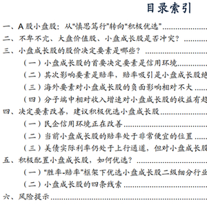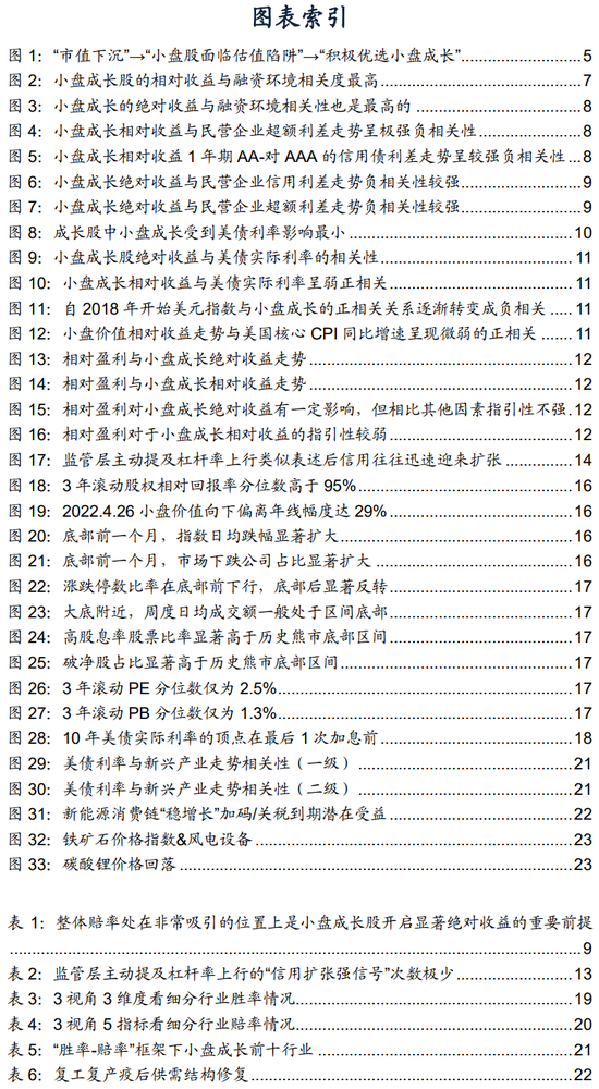 ● 小盘成长股的股价决定要素是哪些?对于小盘成长股来说,分母端的驱动力>分子端的驱动力,国内要素影响力>海外要素影响力。成长股股价往往对分母端的敏感性更为强烈,A股小盘成长股的决定性要素是民营企业信用环境;而与大盘成长股不同的是,美债实际利率并非A股小盘成长股的股价决定性要素。其次影响要素是赔率,赔率吸引是小盘成长股绝对收益的前提。而分子端的相对盈利/收入增速,对于小盘成长的绝对/相对收益指引意义则弱于分母端。