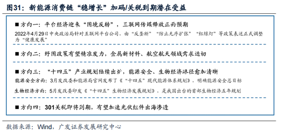 线索三:新能源消费链“稳增长”加码/关税到期潜在受益(光伏组件/互联网传媒)。(1)平台经济迎来“困境反转”(4月份游戏版号重启发放),互联网传媒释放正面预期;(2)纾困政策有望精准发力,金属新材料、航空航天等高库存凸显供需矛盾;(3)“十四五”产业规划陆续出炉(现代能源体系确立+首发生物经济五年规划),能源安全、生物经济路径愈加清晰;(4)301关税即将到期(两项行动将分别于今年7月6日和8月23日到期),若关税取消,将加速光伏组件出海渗透。