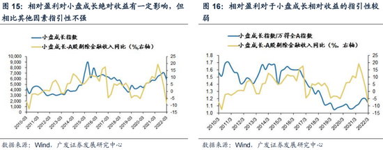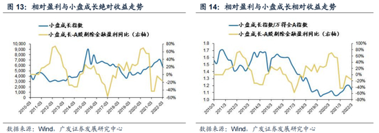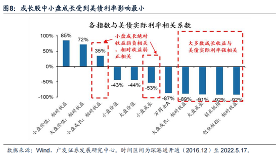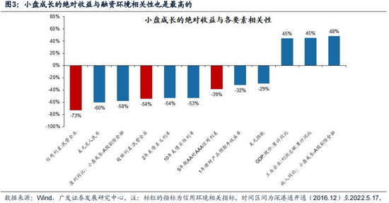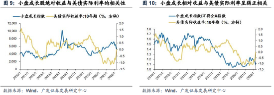 与大盘成长股有所不同的是,海外要素并非小盘成长股的决定要素。部分投资者担心小盘成长股会受到美联储紧缩的影响,美债实际利率上行对小盘成长股显著压制;但实际上小盘成长股的绝对收益受到美债利率影响有限,其与美债实际利率相关性为-53%,显著弱于大盘成长股、创业板的-90%+,同时小盘成长股的相对收益与美债收益率呈弱正相关。