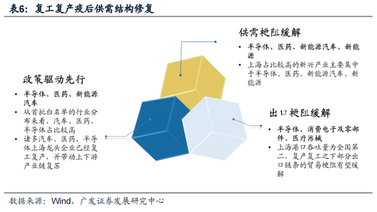 线索二:复工复产疫后供需结构修复(半导体/医药/新能源汽车)。复工复产呈现三条修复方向:(1)政策驱动先行:复工复产“白名单”保障部分重点产业先行复工:半导体/医药/新能源汽车;(2)供需梗阻缓解:复产复工之下,上海经营占比高的产业受益更为直接:半导体(制造/设计/设备)、医药(CXO/To-C医疗服务)、新能源汽车(整车/零部件)、新能源(风电/光伏电池组件);(3) 出口梗阻缓解:出口占比高的产业有望受益:半导体(集成电路)、新能源汽车(整车)、消费电子及零部件等。