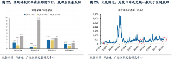 流动性:符合底部特征。从历史经验来看,大底附近周度日均成交额一般处于区间底部。A股小盘成长4次大底中,成交额均有显著下降。2022年4月26日,日均成交额较六个月前、三个月前、一个月前分别下降7.0%、7.4%、3.6%,处于成交额区间底部。