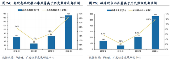 高股息率股比率与破净股比率:均符合底部特征。2022年4月26日股息率大于5%的股票数量为171只,占比3.6%,四次熊市底部时期为61-210只股票,占比在1%到2.4%之间;破净股数量为562只,占比11.8%,四次熊市底部时期为20-33只,占比在2%到6%之间。当前高股息率股票比率与破净股比率显著高于历史熊市底部区间,满足底部特征。
