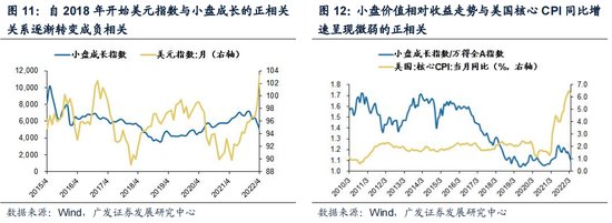 除美债利率之外,其他海外因素对于小盘成长股绝对/相对收益走势的影响相对信用环境因素来说也较弱。虽然美元指数与小盘成长股绝对收益之间呈现较弱负相关性(-0.295),但我们从下图可以看到,这种相关关系的方向有较大的不确定性,因此美元指数对小盘成长股的抑制程度总体来说较小;同时,虽然自2018年开始美元指数与小盘成长股绝对收益的正相关关系逐渐转换成负相关关系,但18年之前的大部分时间两者基本同向变动,因此美元指数对小盘成长股的绝对影响实际上是非常不确定的。而其他海外因素例如美国核心CPI同比增速、美国联邦基金利率、标普500指数等类似要素,与小盘成长股的绝对收益以及相对收益之间的相关系数均低于0.3,从走势来看,对小盘成长股收益走向的解释性也较弱。
