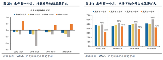指数日均跌幅:符合底部特征。从小盘成长指数日均跌幅看,底部形成前1个月指数日均跌幅在-0.3%至-1.3%,且相比前3个月、前6个月跌幅均有所放大;同时在底部右侧1个月,指数由跌转涨。2022年4月26日前1个月跌幅有所放大,并在底部后明显反转。