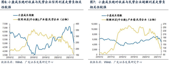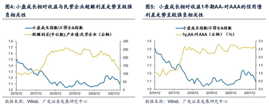 (2)小盘成长股绝对收益:民营企业信用利差走势和民营企业超额利差走势与小盘成长股相对收益具有显著的负相关性。大体上来看,信用利差与超额利差下行时,我国的小盘成长绝对收益表现较好。