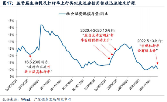 5月13日,央行在就4月金融统计数据答记者问上“宏观杠杆率会有所上升”的罕见表述意味着未来信用扩张将加快。历史上,除本轮外监管层主动提及杠杆率上行的“信用扩张强信号”次数极少,仅有16年6月、20年的4、5、10月共计2轮。可以看到,在监管层主动提及杠杆率上行类似表述后信用往往迅速迎来扩张。同时,央行还表示:“下一阶段,人民银行将按照党中央、国务院决策部署,将稳增长放在更加突出的位置,加大稳健货币政策的实施力度,更好发挥货币政策工具的总量和结构双重功能,加快落实已出台的政策措施,积极主动谋划增量政策工具,支持经济运行在合理区间。”此表述进一步确认了稳增长在当前政策中的重要性。
