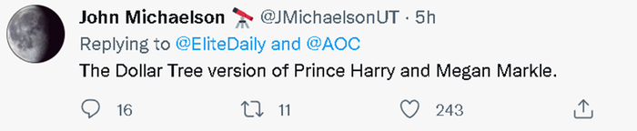 有人还将AOC与她的白人未婚夫,与在英国网络上同样争议很大的英国王室夫妇哈里与梅根进行了对比,称她俩是“丐版的哈里与梅根”。