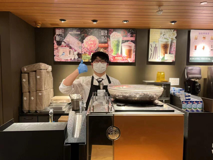 在防疫措施方面,复工的星巴克门店严格执行政府规定的各项防疫要求,包括确保员工每日核酸为阴性;加强门店环境消杀工作;“专星送”使用专用密封袋与杯盖;取餐至配送全程无接触;骑手小哥每日测温并消毒配送箱等,让顾客喝上放心、安心的饮品。