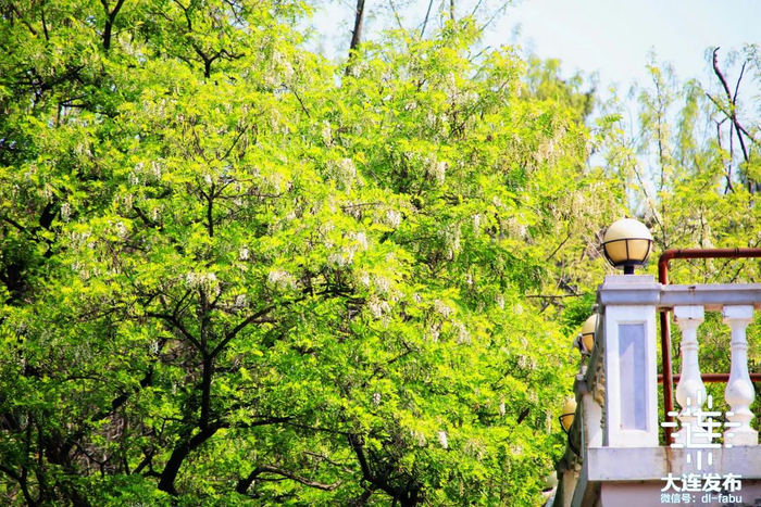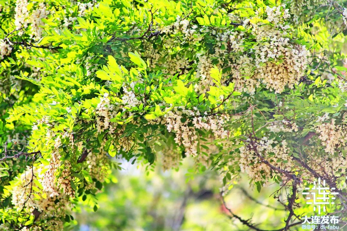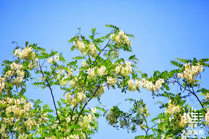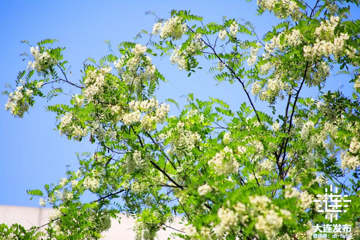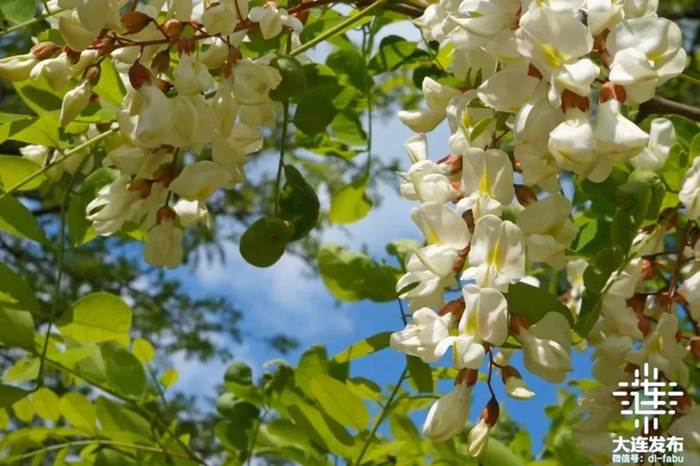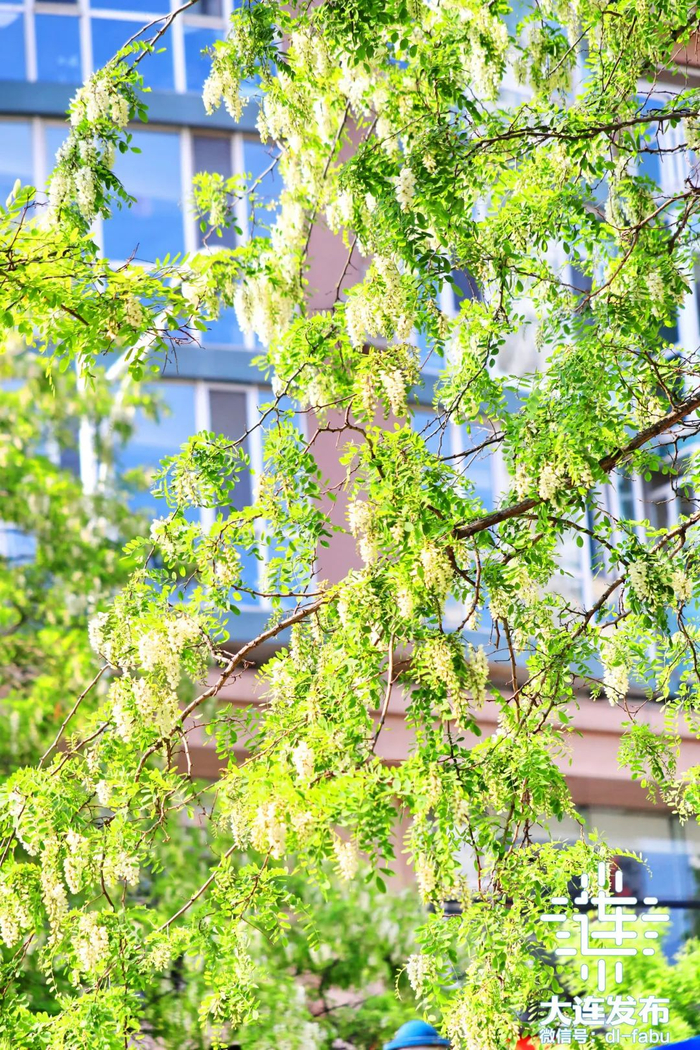 槐花与海,是大连独特的基因,槐情与山海,交融出了大连特别的风景线。5月的大连,槐香阵阵,棒棰岛至滨海路路段,槐花盈盈绽放,微咸的海风中,温柔缱绻着清新的花香。因为临海气温略低,棒棰岛宾馆景区的槐花要比市区内迟开几日。