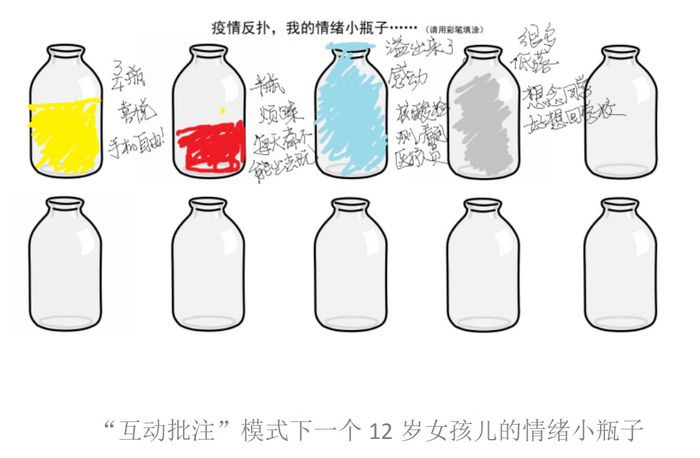 最后发言是一个腼腆的女孩,她在分享完几个情绪瓶之后,深吸了一口气,才继续下去:“还有两瓶,本来不好意思和你们说,但……还是说一下吧。嗯,这一瓶是想念学校,我本来方向感就不好,学校又大,六年级上学期总算把各个教室都认全了。现在疫情了,再回学校,好怕自己又不认路了。”女孩笑着停顿了一下,接着说:“还有一瓶,也是想念……是想念你们。”她的声音很轻,但话语很清晰。