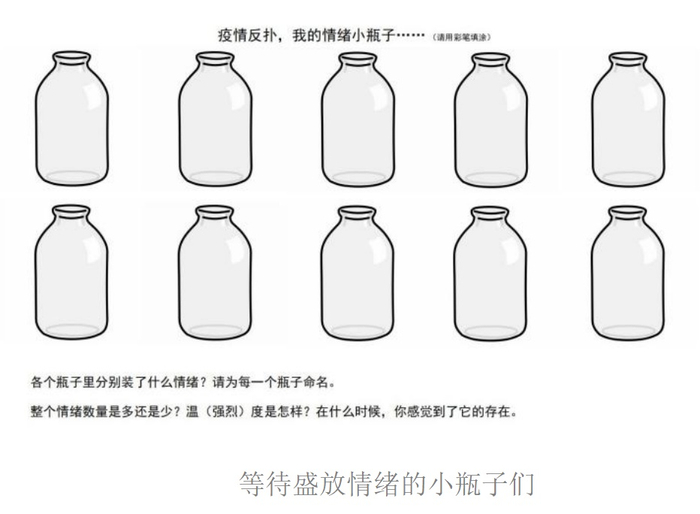 “各位同学,如果简单的数字不够表达,就让我们静心沉淀、分类整理,把情绪按照种类分‘瓶’盛放到眼前的这些小瓶子里。每种情绪装了多大一瓶?温度是怎样?什么时候,它会出现?请让感受带动画笔,开始我们的涂鸦。”