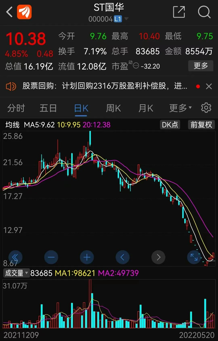 业绩对赌期内,智游网安业绩完成率分别为101.10%、64.89%、32.57%,触发业绩补偿条款。2021年,因ST国华在商誉减值相关内控、收入截止相关内控、员工薪酬及采购相关内控等三方面存在重大缺陷,致同会计师事务所出具了“否定意见”内控审计报告及“保留意见”财务审计报告。5月6日,公司被“ST”。5月6日—5月13日,ST国华股价连续6个交易日跌停;