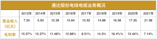 从上图可以看到,近十年来,通达股份电线电缆业务收入基本呈现上升态势,但毛利率波动较大,数次出现大幅下滑。