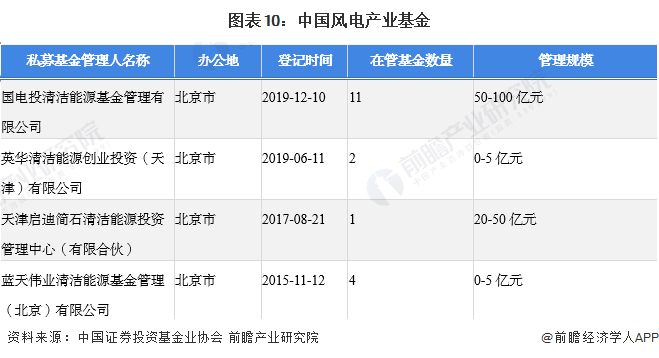 目前风电行业的产业投资基金主要包括以下四家,其中国电头清洁能源基金管理有限公司规模最大,目前在管基金数量达到了11支,管理规模为50-100亿元。