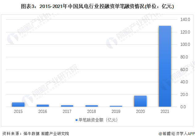 从单笔融资金额来看,2015-2021年风电行业单笔融资金额呈先减后增的态势,2020年单笔融资金额达到了17.9亿元,2021年更是高达130.1亿元。结合前文的分析,这主要是因为行业融资进入后期阶段,主要的融资事件均为企业IPO,导致单笔融资金额快速上升。