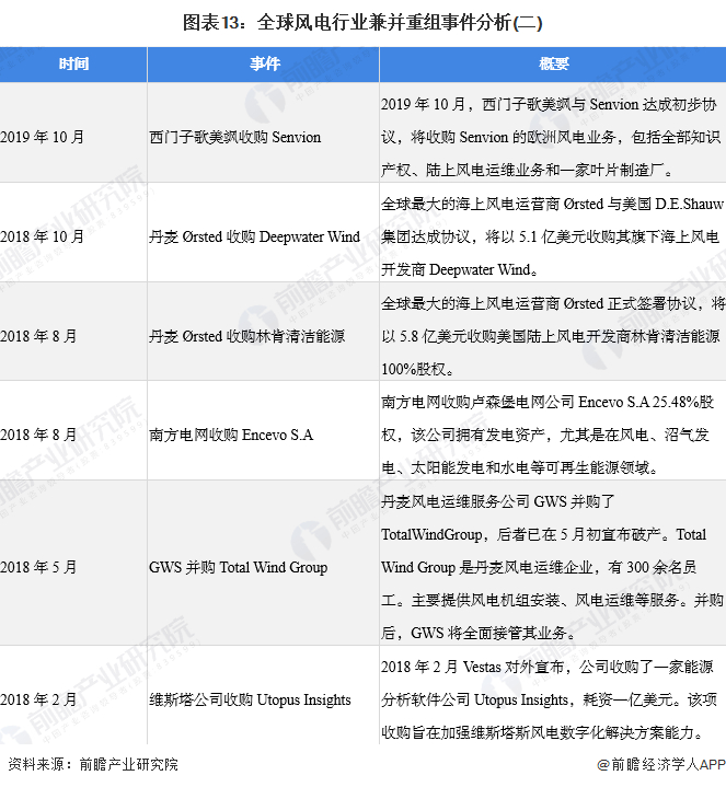 全球风电市场兼并重组事件与中国风电市场呈现一样的趋势,行业内部龙头企业通过兼并不断扩大自身规模,同时也有许多其他行业的企业为赚取行业快速发展的红利通过收购进入该市场。