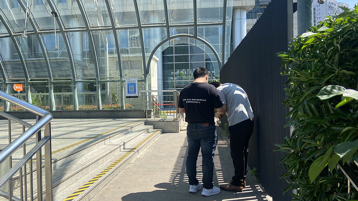 5月22日,地铁6号线世纪大道站外,徐先生和邱先生不停地刷着手机,等待着自己的核酸结果。本文图片 澎湃新闻记者 巩汉语 图