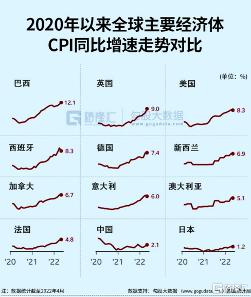 今年4月,英国通胀创下9%,创下上世纪80年代末开始相关官方统计以来的最大涨幅。另外,德国7.4%,意大利6%,法国4.8%均创下数年新高。