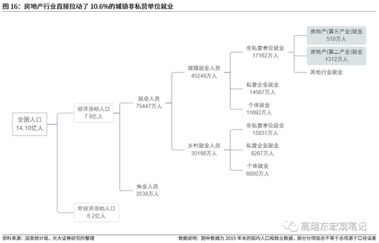 可以看到,截至2019年末,在1.7亿城镇非私营单位就业人员中,约有510万人直接从事第三产业中的房地产业,约有1312万人直接从事第二产业中的房屋建筑和装修业,广义房地产部门合计城镇非私营单位就业人员约有1822万人,约占城镇非私营单位就业人员的10.6%。