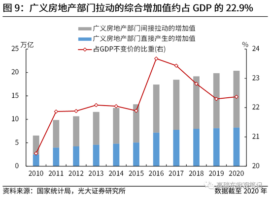 核心观点:住房市场化改革以来,房地产行业经过近30年的蓬勃发展,已经成为影响和拉动经济增长的核心产业链。根据2020年投入产出表的投入产出关系测算,2016年—2020年,广义房地产部门年均拉动约占GDP 22.9%的增加值产出,年均拉动不变价GDP增速1.2个百分点,创造的相关信贷占信贷余额的39.1%,年均拉动信贷增速6.7个百分点,拉动了约11.4%的城镇非私就业。