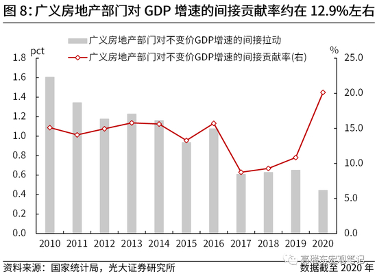 在上述广义房地产部门的定义之下,结合2010年—2020年国家投入产出表,我们便可以大概匡算出,广义房地产部门在国内经济中的占比,以及对国内经济增长的拉动作用。可以看到,2016年-2020年,广义房地产部门增加值占GDP比重的均值约在9.5%左右,对不变价GDP增速拉动的均值约为0.5个百分点,对不变价GDP增速的贡献率约为8.0%。