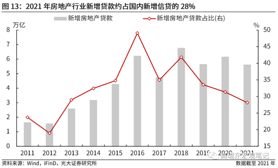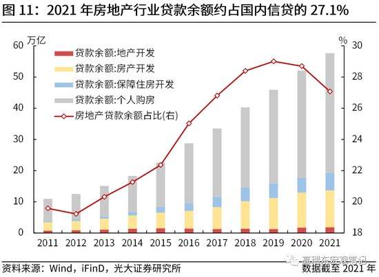 增量方面,2008年全球金融危机后,伴随着净出口对国内经济增长的拉动作用逐渐减弱,房地产和基建对经济增长的拉动作用日益增强。在此过程中,金融作为经济的镜像,新增房地产贷款在新增信贷中的占比逐年提升,2016年一度触及49.1%,也就是说,2016年将近一半的新增信贷由广义房地产部门直接创造。但是,快速发展的房地产部门也带来了一系列的隐性风险,2016年中央经济工作会议首次提出“房子是用来住的,不是用来炒的...综合运用金融、土地、财税、投资、立法等手段...抑制房地产泡沫”。此后,新增房地产贷款在新增信贷中的比重持续下行,2021年已经降至28.1%,但仍具有举足轻重的作用。