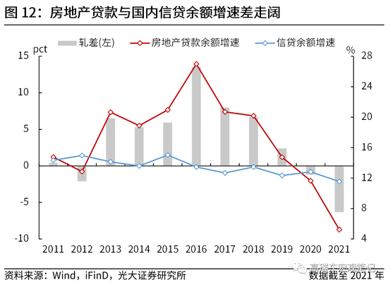 融资作为经济增长的前瞻指标,广义房地产部门对融资增速的拉动作用同样不可小觑。从广义房地产部门直接拉动的信贷来看,存量方面,2021年房地产贷款余额为52.2万亿元,约占国内信贷余额的27.1%,其中,个人住房贷款和房产开发贷款构成房地产贷款的主要部分,体量分别约为38.3万亿元和11.8万亿元。另外,房地产贷款余额增速,已从2016年27.0%的高点降至2021年的5.2%,并于2020年开始低于国内信贷余额增速,2021年相较国内信贷余额增速的缺口扩大至6.3个百分点。