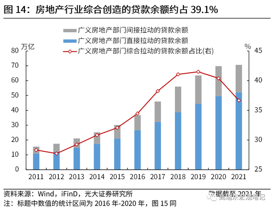 可以看到,在疫情前的2019年,广义房地产部门直接和间接拉动的贷款余额合计有63.5万亿元,占国内信贷余额的比重约为41.5%。2020年以来随着“三线四档”和“房贷集中度管理”等措施的出台,广义房地产部门拉动的信贷余额占比开始呈现下降趋势,2021年约为36.7%。2016年至2020年,广义房地产部门拉动的信贷余额,年均约占国内信贷余额的39.1%。