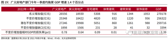 广义房地产部门低迷约拖累一季度GDP增速1.4个百分点。如果我们以2016年至2019年广义房地产部门的实际复合增速,作为广义房地产部门的潜在增速水平,则可以在2021年一季度广义房地产部门增加值的基础上,大概测算出2022年一季度广义房地产部门的潜在增加值。然后用潜在增加值减去实际增加值,作为2022年一季度广义房地产部门的缺口,进而通过2020年国家投入产出表测算出的拉动系数,测算出2022年一季度GDP的缺口。GDP缺口与2021年一季度实际GDP的比值,便是由于广义房地产部门萎缩,所带来的实际GDP损失。