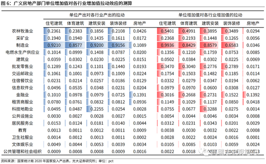 从测算结果来看,狭义房地产部门所创造的单位增加值,对金融业、租赁和商务服务业以及制造业部门的增加值拉动效应最为明显,分别为0.14、0.04和0.03个百分点;住宅建筑部门所创造的单位增加值,对制造业、农林牧渔业和批发零售业部门的增加值拉动效应最为明显,分别为0.99、0.54和0.35个百分点;体育和其他建筑部门所创造的单位增加值,对制造业、农林牧渔业和批发零售业部门的增加值拉动效应最为明显,分别为0.84、0.50和0.30个百分点;建筑安装部门所创造的单位增加值,对制造业、农林牧渔和科技地质勘探部门的增加值拉动效应最为明显,分别为0.86、0.39和0.33个百分点;装饰装修部门所创造的单位增加值,对制造业、农林牧渔业和批发零售业部门的增加值拉动效应最为明显,分别为0.66、0.35和0.28个百分点。