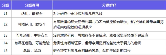 目前哺乳期合理用药在国内比较常用的是由临床药理学家、儿科学教授 Hale 提出的 L 分级。