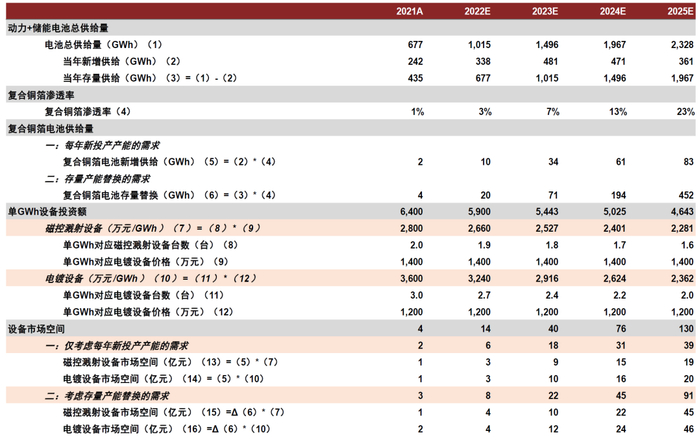 市场空间:我们根据以下假设,测算到2025年国内锂电复合铜箔设备市场合计为130亿元;其中,到2025年当年新投产产能设备需求为39亿元,存量产能中设备替换需求为91亿元。