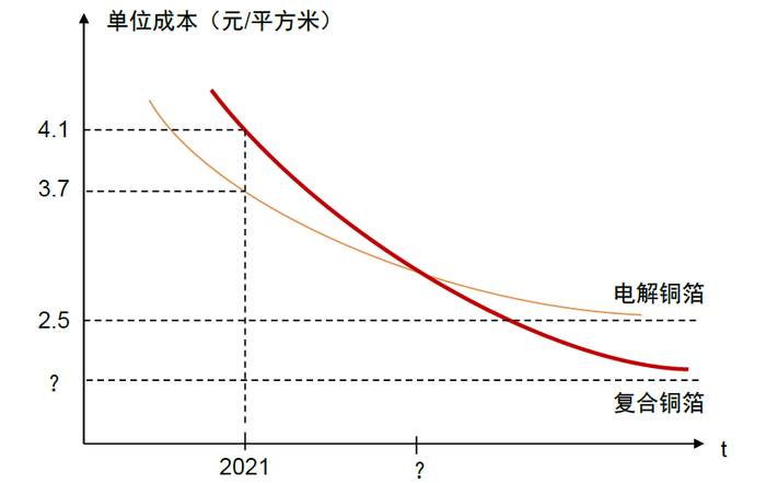 规模化量产及设备效率提升后,复合铜箔生产成本或低于电解铜箔的成本下限。总体看,我们认为复合铜箔成本下降空间更大。