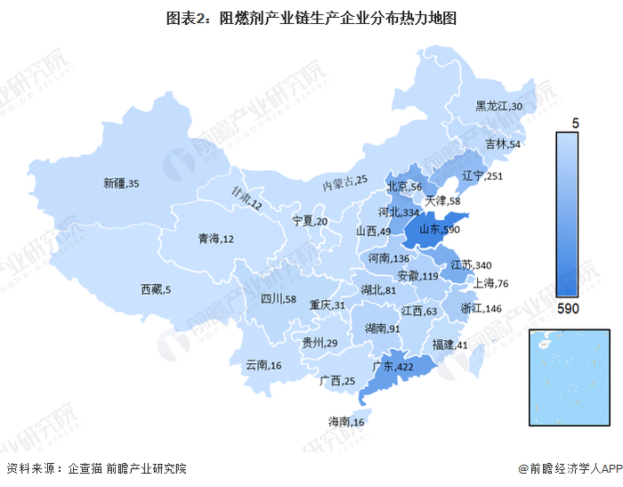 根据企查猫数据,截止2022年5月12日,经营范围包括阻燃剂的企业数量共计3245家。分区域来看,我国阻燃剂企业主要集中在京津冀、长江三角洲与珠江三角洲等高技术发达地区,山东省的阻燃剂企业最多,达到590家;其次,广东省、河北省和江苏省的阻燃剂企业也较多,均超过300家。