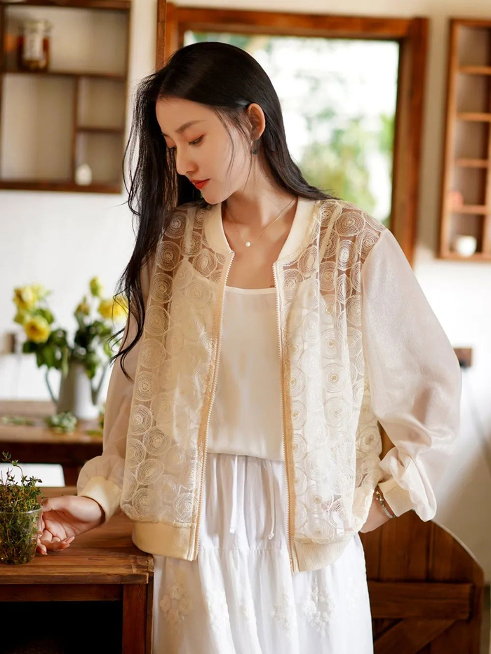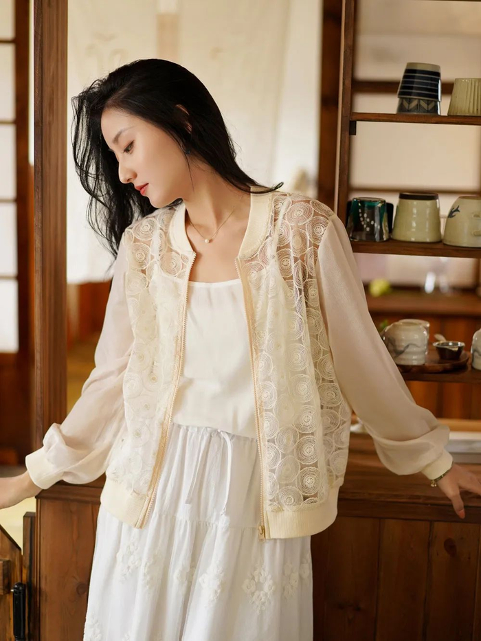 棒球服的款式,为它增添了休闲感,中和了蕾丝和网纱温柔朦胧的感觉。