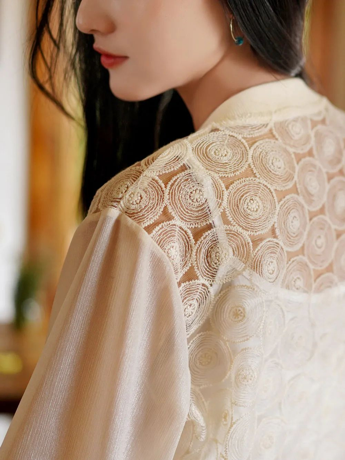 一圈圈的蕾丝刺绣犹如荡漾的水纹温柔缱绻,轻薄的网纱朦胧浪漫,展现了女性柔美的一面。