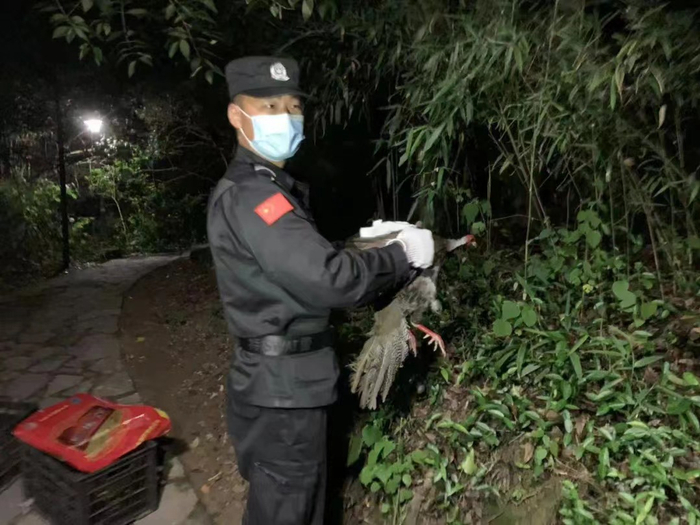 5月8日21时许,青阳县公安局陵阳派出所民警接群众报警称,其家中闯入一只“大鸟”,疑似国家保护动物,恳请民警予以救助。民警立即赶到现场,发现“大鸟”羽翼和尾部羽毛为白色,头部为赤红色,下体蓝黑色,脚为红色。民警现场确认该鸟学名白鹇,系国家二级保护动物。随后,民警连夜将其带往附近野外放生。