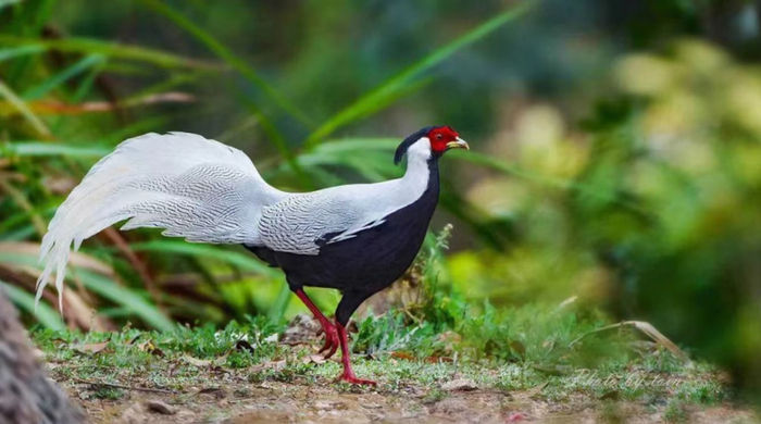 白鹇(学名:Lophuranycthemera):国家二级保护动物,属于大型鸡类。雄鸟全长100-119厘米,雌鸟58-67厘米。头顶具冠。嘴粗短而强壮,上嘴先端微向下曲,但不具钩;鼻孔不为羽毛所掩盖着。翅稍短圆。尾长。跗蹠裸出,雄性具距,但有时雌雄均有;趾完全裸出,后趾位置较高于他趾。雌雄异色;雄鸟上体白色而密布以黑纹,头上具长而厚密、状如发丝的蓝黑色羽冠披于头后;脸裸露,赤红色;尾长、白色,两翅亦为白色。下体蓝黑色,脚红色。雌鸟通体橄榄褐色,羽冠近黑色。