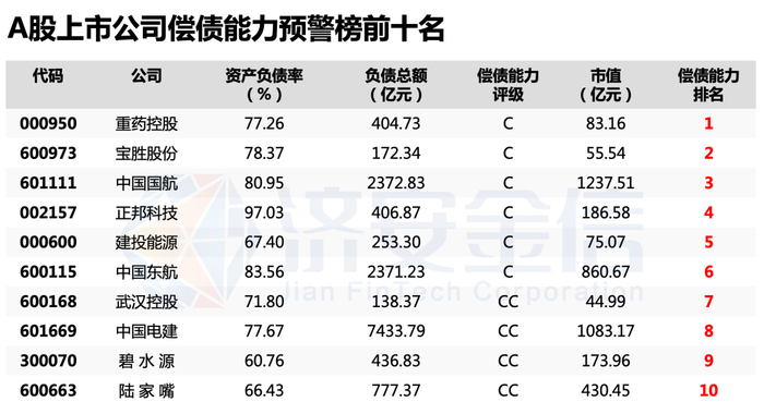反观4400家公司中的偿债能力预警榜,重药控股排在偿债能力评级倒数第一。排在偿债能力预警榜前10名的公司分别为重药控股、宝胜股份、中国国航、正邦科技、建投能源、中国东航、华电能源、武汉控股、中国电建、碧水源,前六家的偿债能力获得了“C”评级,后四家获得“CC”评级。
