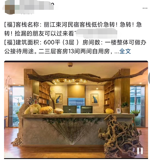 “直降200万,丽江精品客栈出售”“丽江民宿客栈低价急转!捡漏朋友看过来”……某短视频平台上,诸如此类信息屡见不鲜。