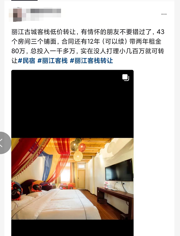 一位民宿经营者今年1月在某短视频平台发布了一则转让信息,一处位于丽江古城,拥有43间房、3个铺面的民宿,之前投资一千多万元,现在小几百万就可以转,而且还带两年租金80万元。在私信中,这位民宿经营者称350万元就可以转让。
