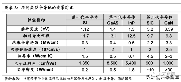 第三代半导体材料禁带宽度远大于前两代。第一代和第二代半导体都是窄带隙 半导体,而从第三代半导体开始,宽禁带(带隙大于 2.2eV)半导体材料开始被大 量应用。碳化硅作为第三代半导体的典型代表,具有 200 多种空间结构,不同的结 构对应着不同的带隙值,一般在 2.4eV-3.35eV 之间。碳化硅材料除宽禁带之外,还 具有高击穿场强、高饱和漂移速度及高稳定性、最大功率等优点。