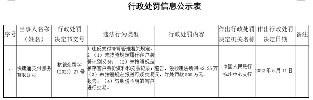 近日,央行杭州中心支行发布了行政处罚信息公示表,快捷通支付服务有限公司(下称“快捷通支付”)因多项违规被没收违法所得43.25万元,并处罚款808万元,共计851.25万元。