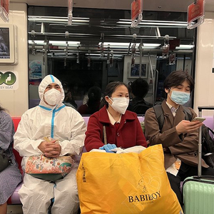洪庐英和董有根夫妇掐着点,提前半小时到达虹桥路地铁站。董有根大病初愈,穿着白色防护服,戴着N95口罩,拎着一个小袋子。洪庐英穿着红色外套,黑色长发简单扎了一下,几缕白发夹杂其中。她戴着一层一次性医用口罩,外面还加了一层N95口罩。她负责拿大件行李。