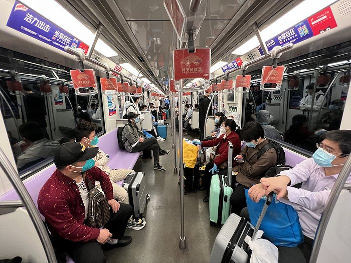 离发车还有几分钟,夫妻二人终于进入地铁,并在第一节车厢处找到座位坐下来。他们将行李放在腿前,双双陷入沉默。7点一到,10号线首班车上乘客已经坐满乘客。地铁准时发车。很多乘客都拖着行李,和洪庐英一样,他们也是去往虹桥火车站准备离开上海。