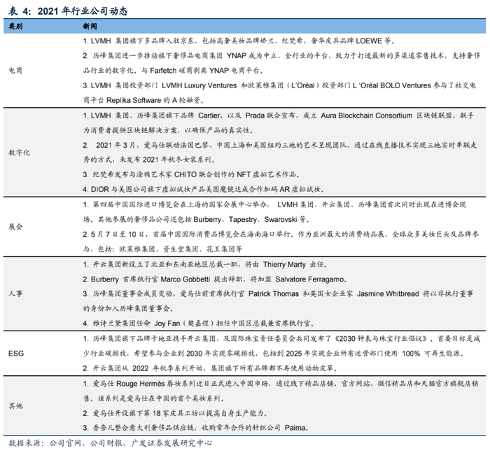 LVMH集团:(1)2021年集团完成对Tiffany的收购、收购Off-White 60%的股权布局时装潮牌并将原有的在疫情下因供应链等原因表现不佳的品牌剥离,如与蕾哈娜合作推出的时装品牌Fenty。(2)集团宣布将在巴黎建造一座全新的奢侈品研究中心,该中心将致力于可持续时尚和数字时尚方面的研究,预计于2024或2025年正式开业。(3)集团举办《200个旅行箱,200位梦想家》巡回展,纪念Louis Vuitton先生200周年诞辰。